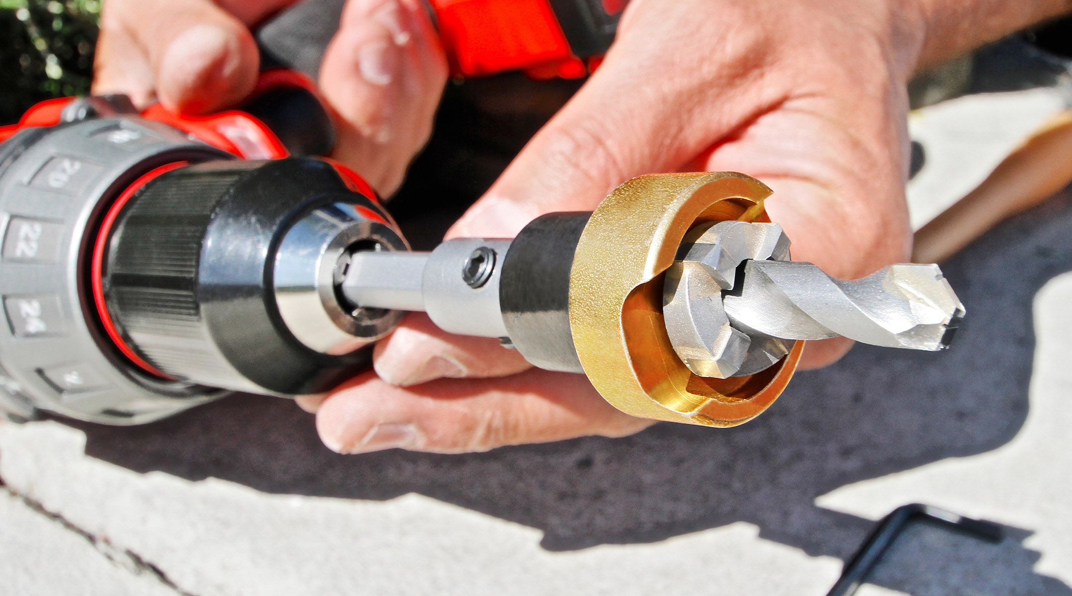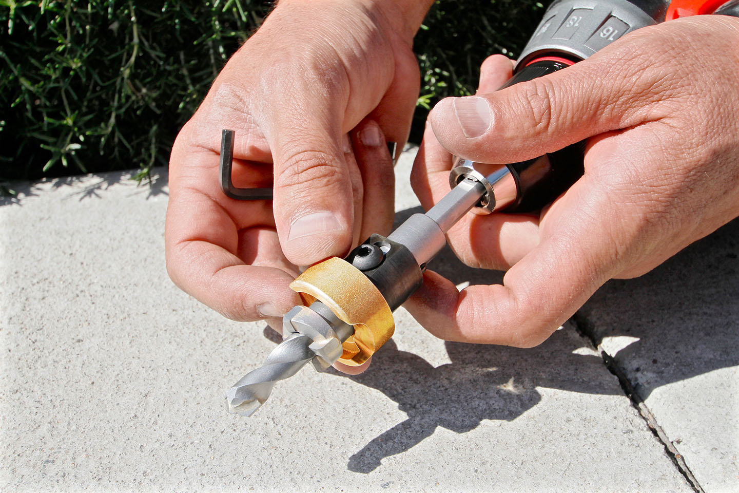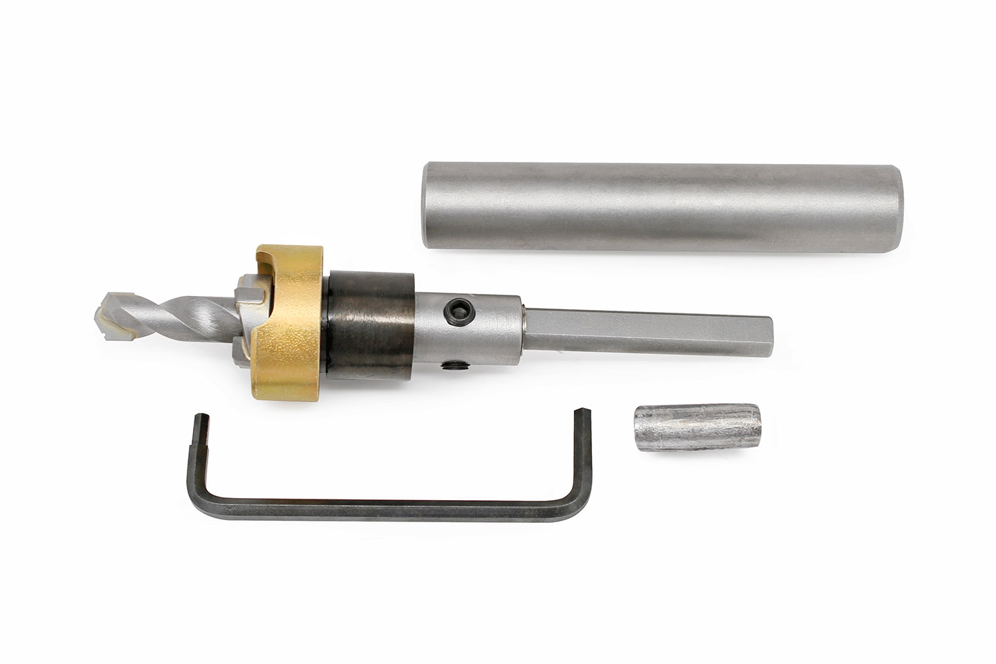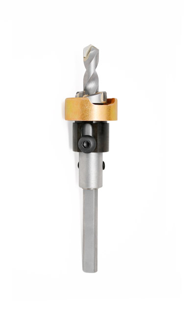Counterbore and drill pilot are independently adjustable to accommodate material depths.